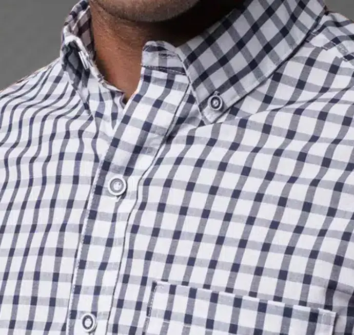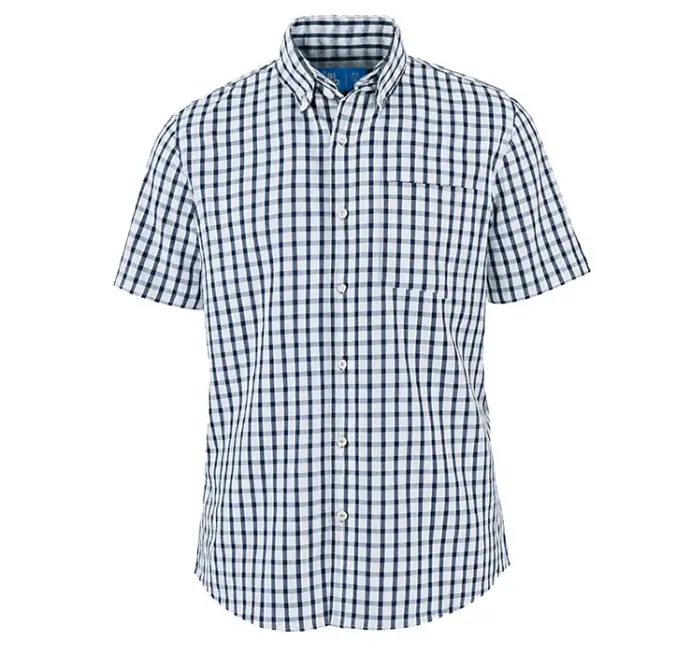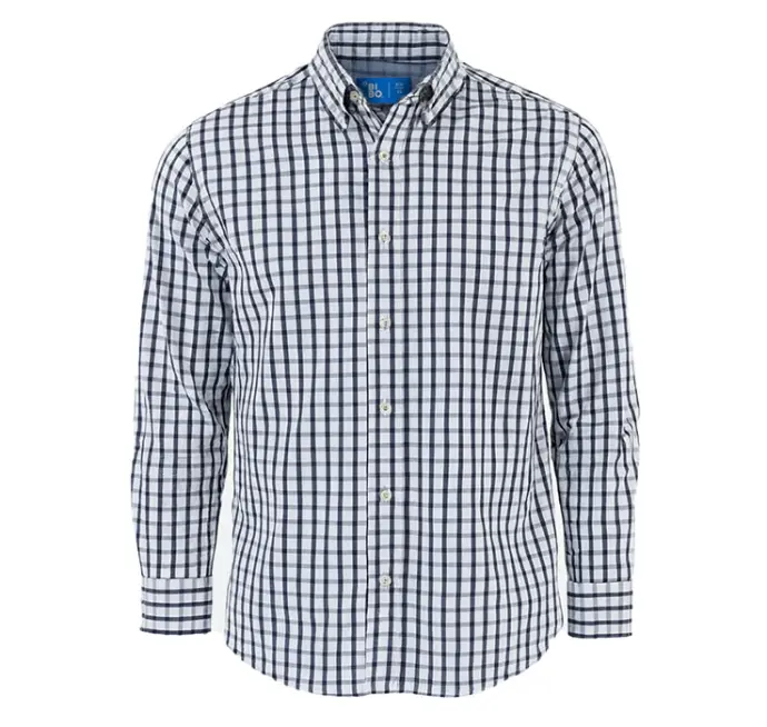 La camisa Bilbao es un gran clásico corporativo que siempre proyecta pulcritud. Su patrón de cuadros marino y blanco es ideal para un código de vestimenta tradicional. Equilibra la suavidad con la resistencia al uso constante.